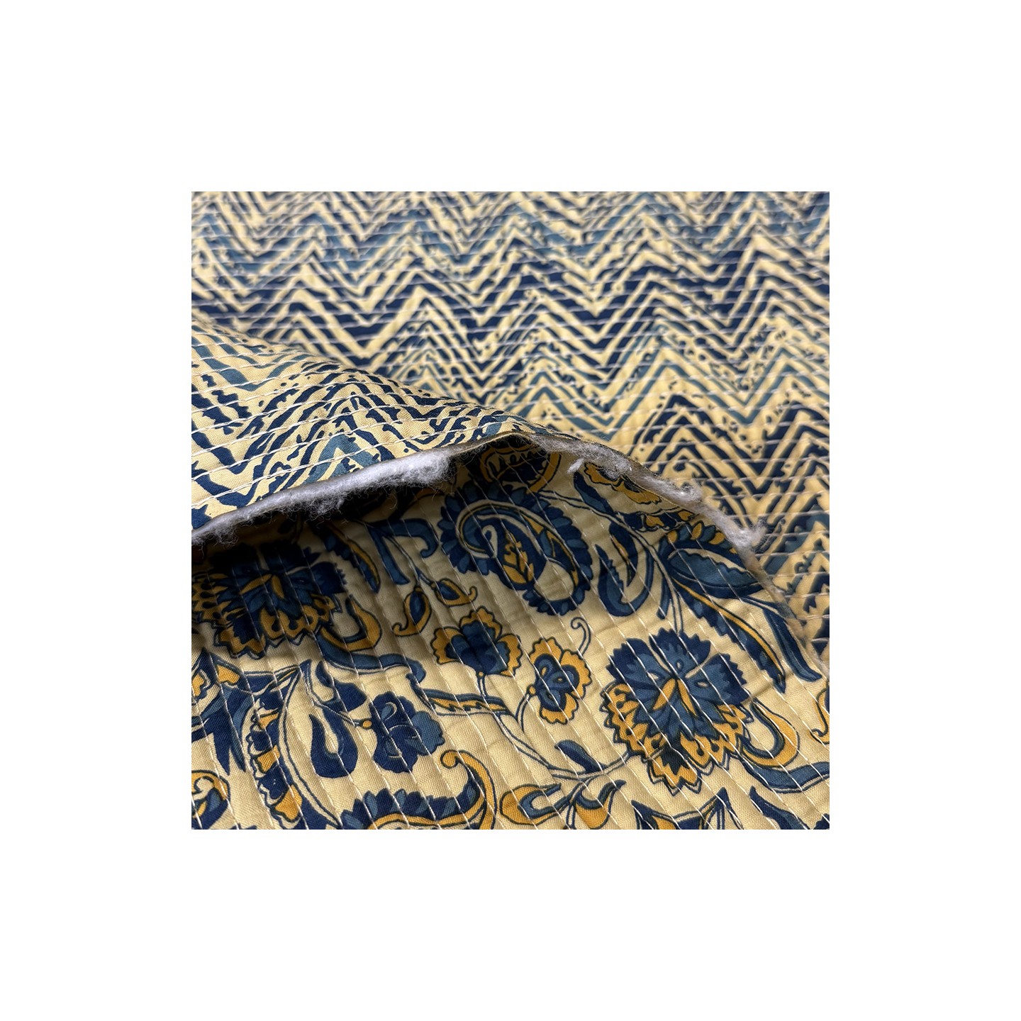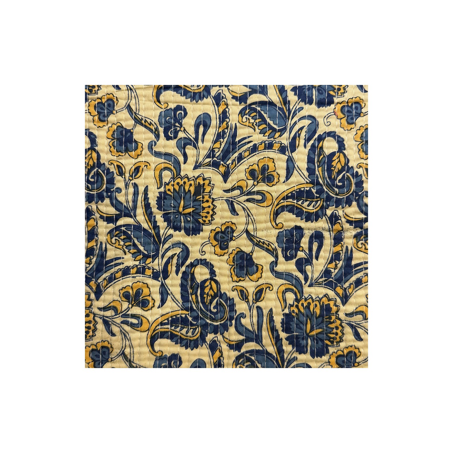 Voyagez au cœur de l'artisanat du Rajasthan avec notre tissu matelassé imprimé au blockprint. Ce tissu d'exception n'est pas une simple impression industrielle : il est le fruit d'un savoir-faire ancestral. Chaque motif est appliqué à la main à l'aide de tampons en bois sculptés, créant des irrégularités charmantes qui rendent chaque mètre de tissu absolument unique.