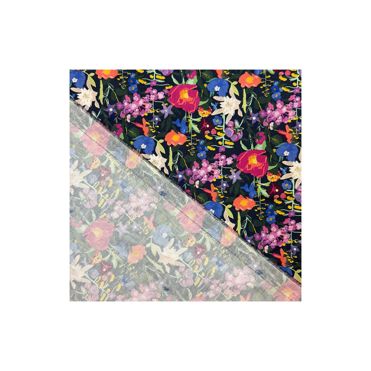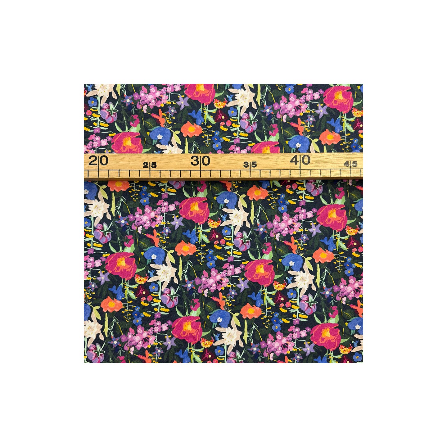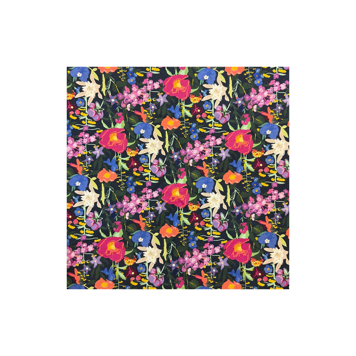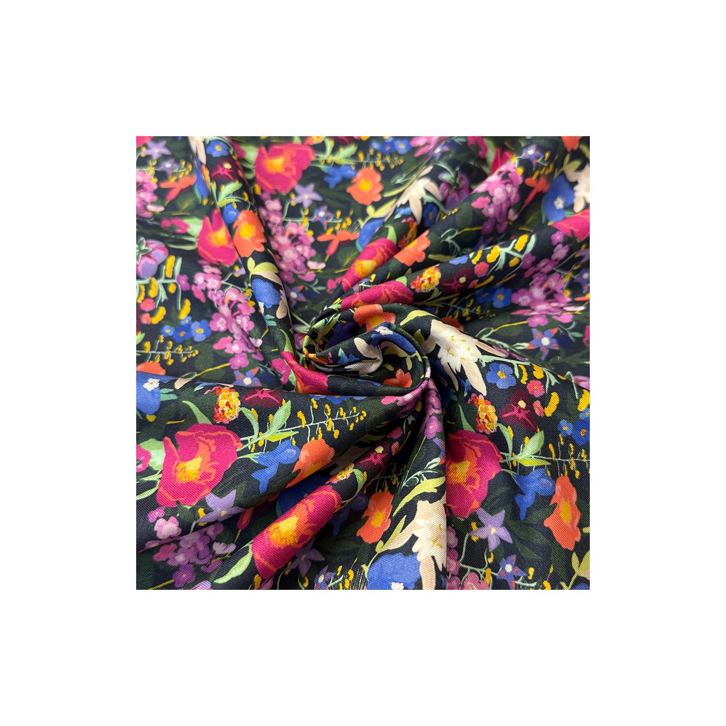 Le visuel de ce tissu est une véritable célébration printanière. Sur un fond noir profond et intense, une multitude de fleurs aux couleurs éclatantes semblent prendre vie. On y retrouve des nuances de rouge cerise, de bleu azur, de jaune d'or et de violet, harmonieusement entrelacées avec des feuillages d'un vert tendre. Ce contraste marqué entre le fond sombre et la vivacité des motifs apporte une profondeur unique et un caractère résolument moderne à vos futures créations.