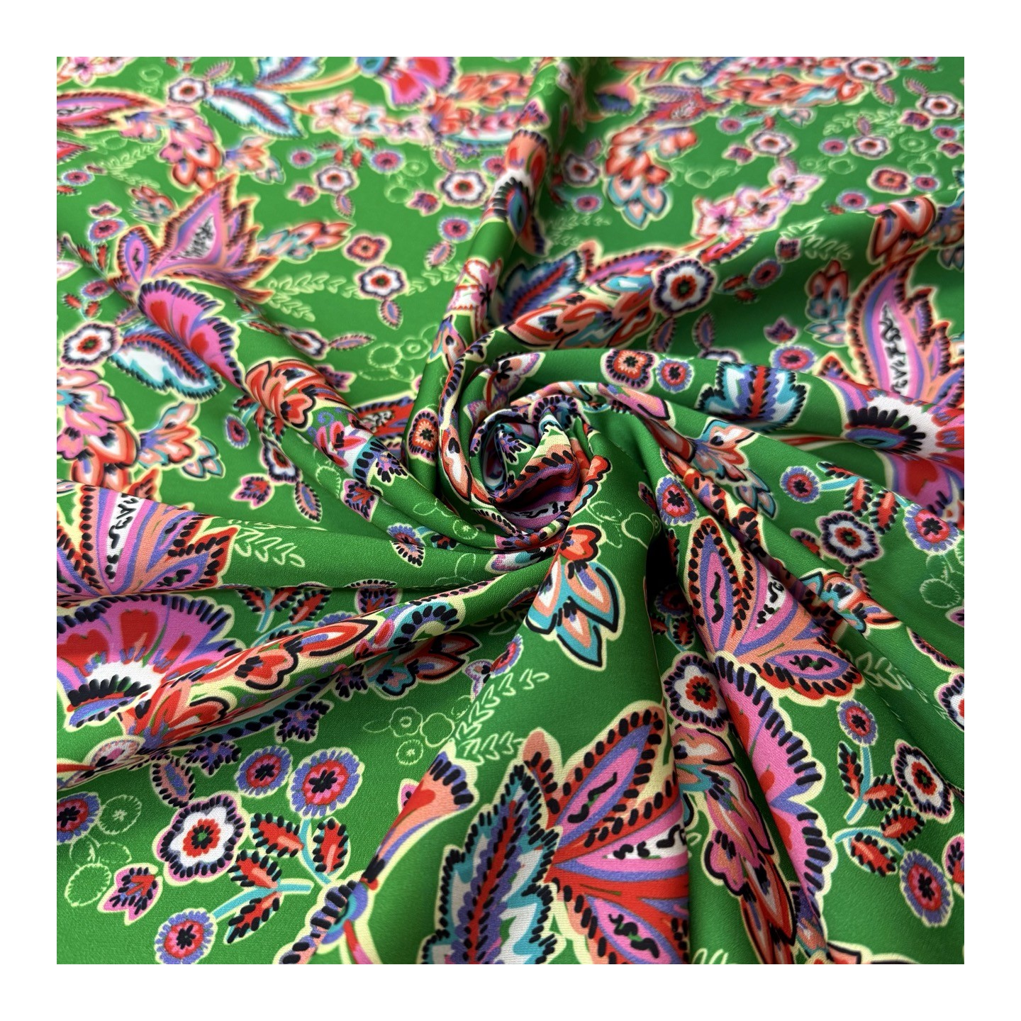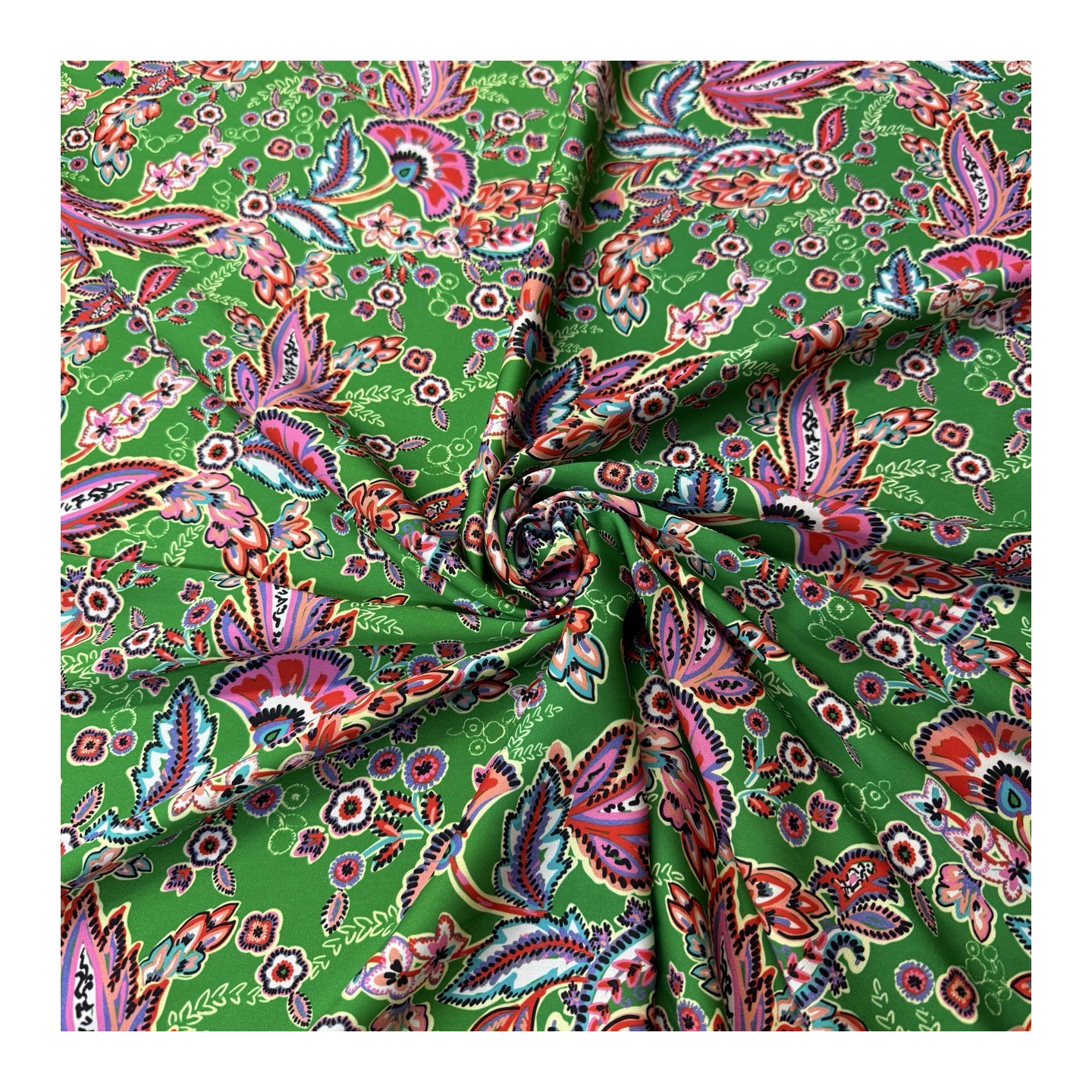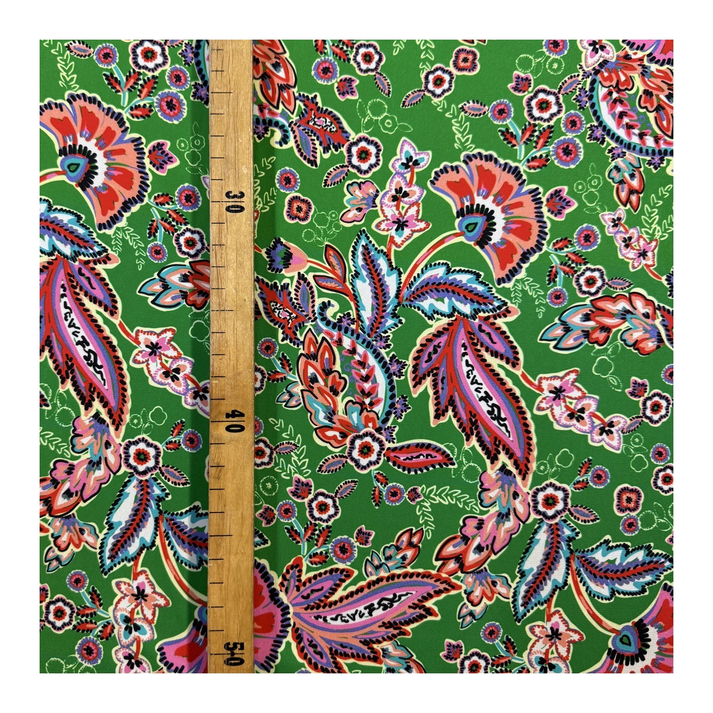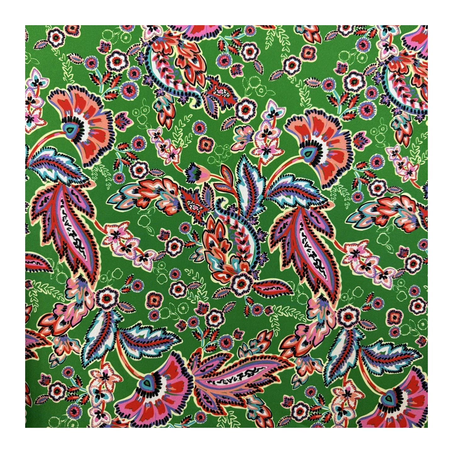 Plongez dans l'univers de la haute couture avec ce tissu en polyester d'exception, fabriqué avec soin dans les ateliers textiles italiens. Réputée pour son savoir-faire inégalé, l'Italie nous offre ici une étoffe qui allie modernité technique et esthétique traditionnelle. Ce tissu se distingue par son fond vert émeraude vibrant, une couleur audacieuse qui sert d'écrin à un motif cachemire (Paisley) revisité, entremêlant des fleurs stylisées aux nuances de corail, de lilas et de bleu azur.