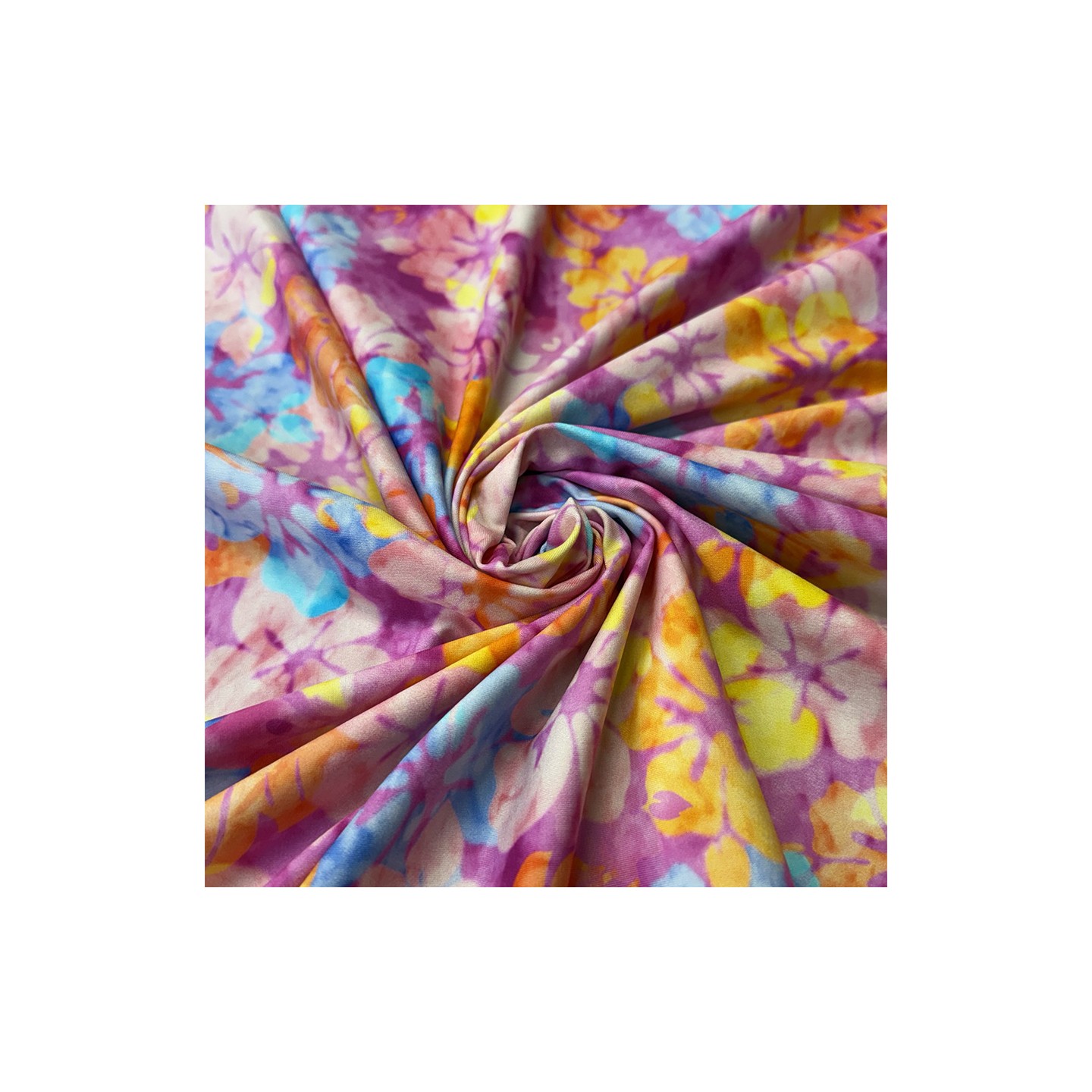 Laissez-vous séduire par l'éclat de notre Lycra Fantaisie au motif floral aquarelle. Véritable explosion de couleurs, ce tissu mêle des nuances vibrantes de violet améthyste, de jaune ensoleillé et des touches de bleu turquoise dans un imprimé fleuri à la fois doux et dynamique. C'est le tissu parfait pour ceux qui veulent transformer chaque mouvement en une œuvre d'art.