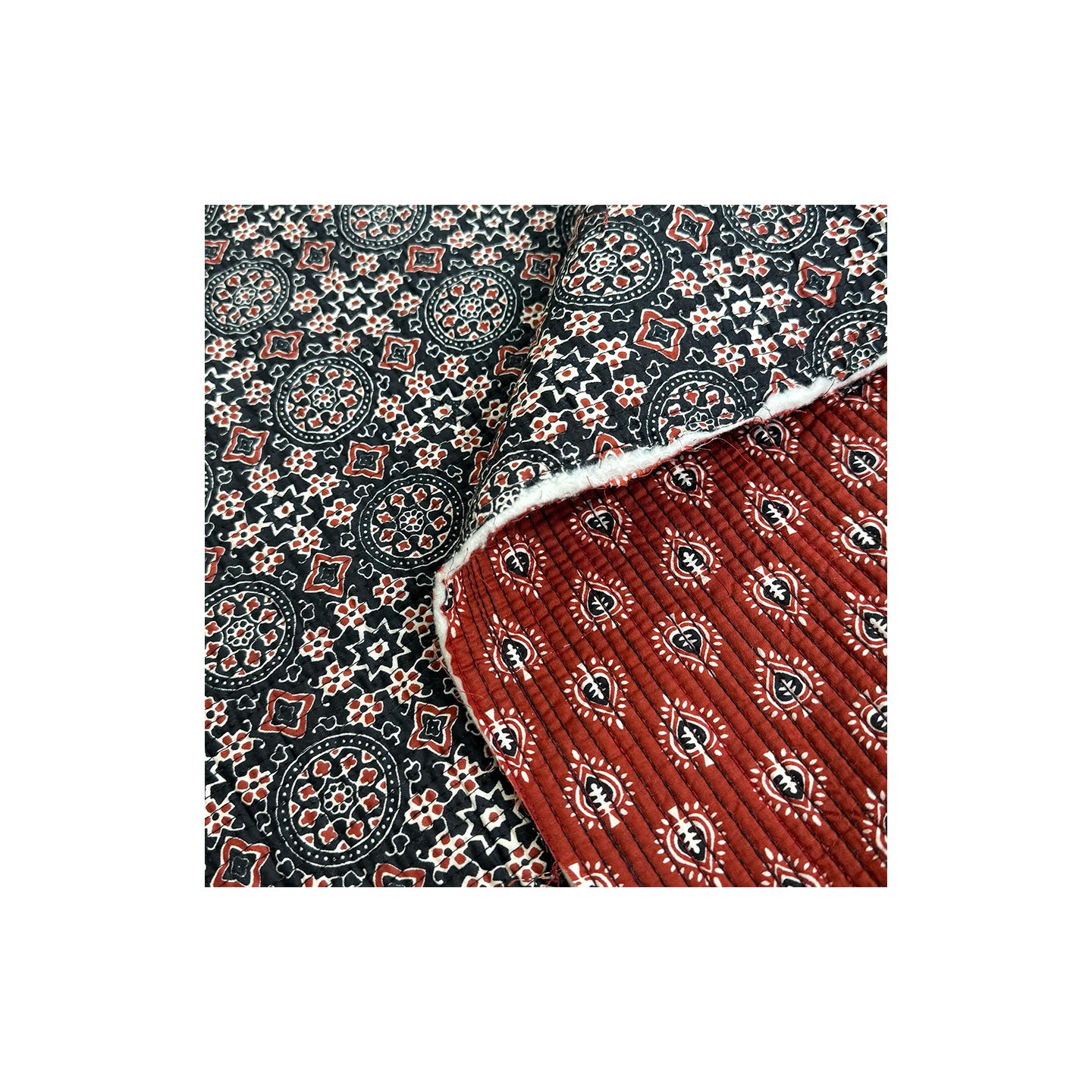 Voyagez au cœur de l'artisanat du Rajasthan avec notre tissu matelassé imprimé au blockprint. Ce tissu d'exception n'est pas une simple impression industrielle : il est le fruit d'un savoir-faire ancestral. Chaque motif est appliqué à la main à l'aide de tampons en bois sculptés, créant des irrégularités charmantes qui rendent chaque mètre de tissu absolument unique.