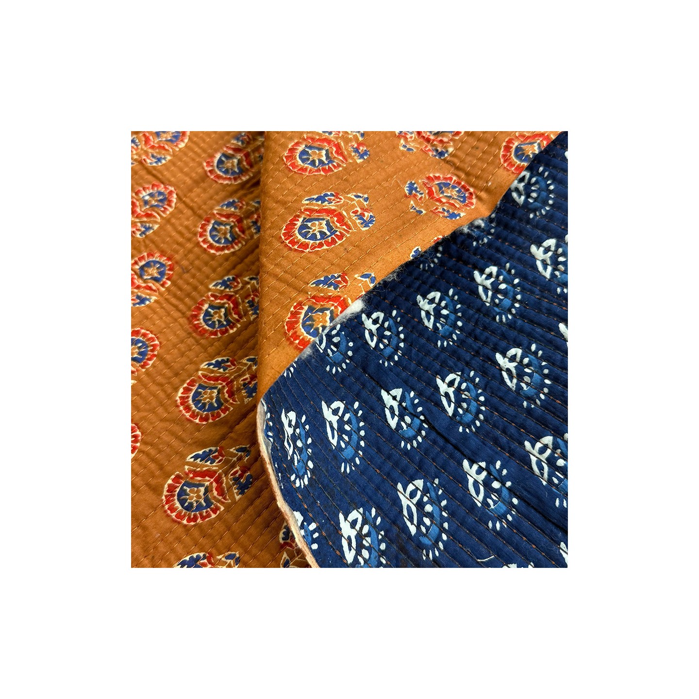 Voyagez au cœur de l'artisanat du Rajasthan avec notre tissu matelassé imprimé au blockprint. Ce tissu d'exception n'est pas une simple impression industrielle : il est le fruit d'un savoir-faire ancestral. Chaque motif est appliqué à la main à l'aide de tampons en bois sculptés, créant des irrégularités charmantes qui rendent chaque mètre de tissu absolument unique.