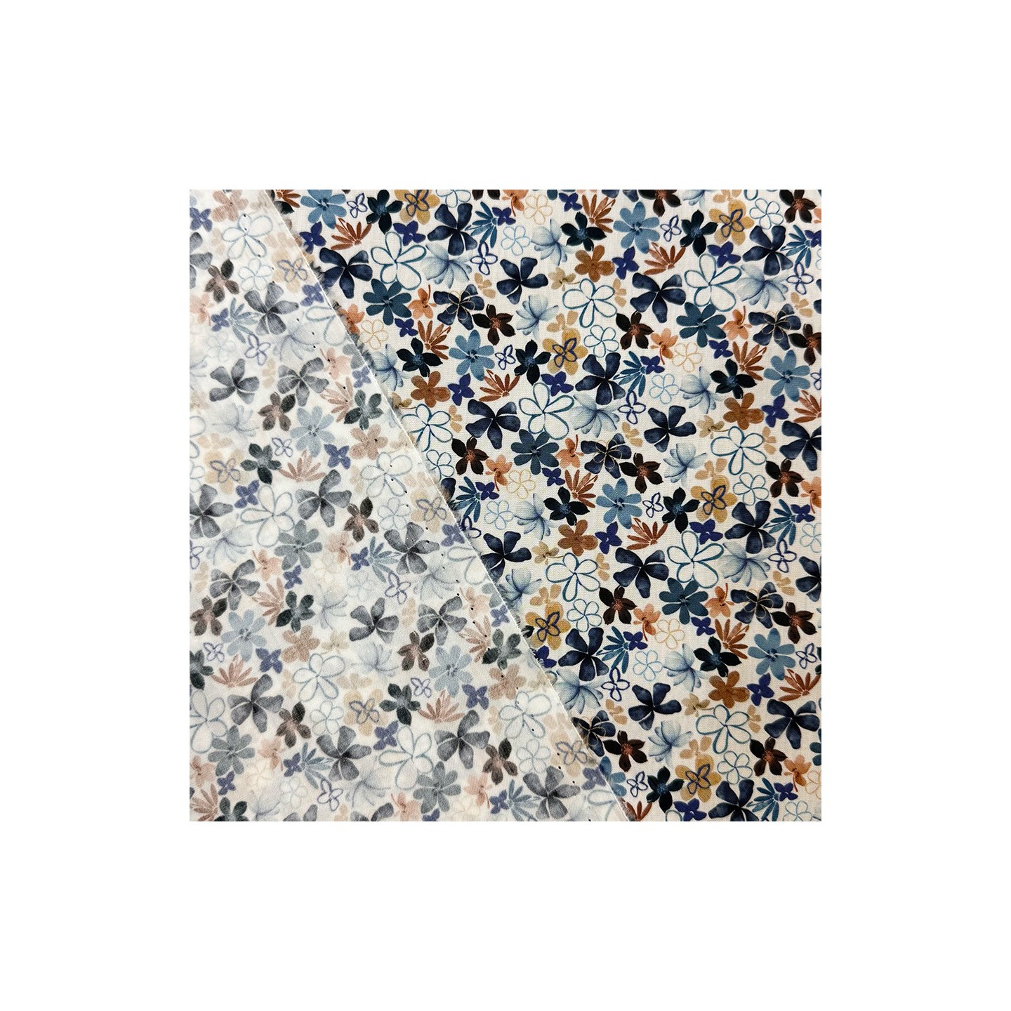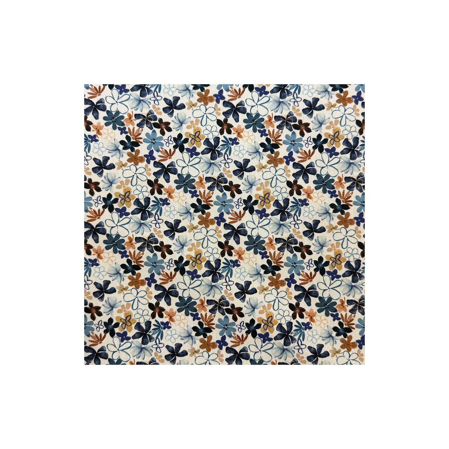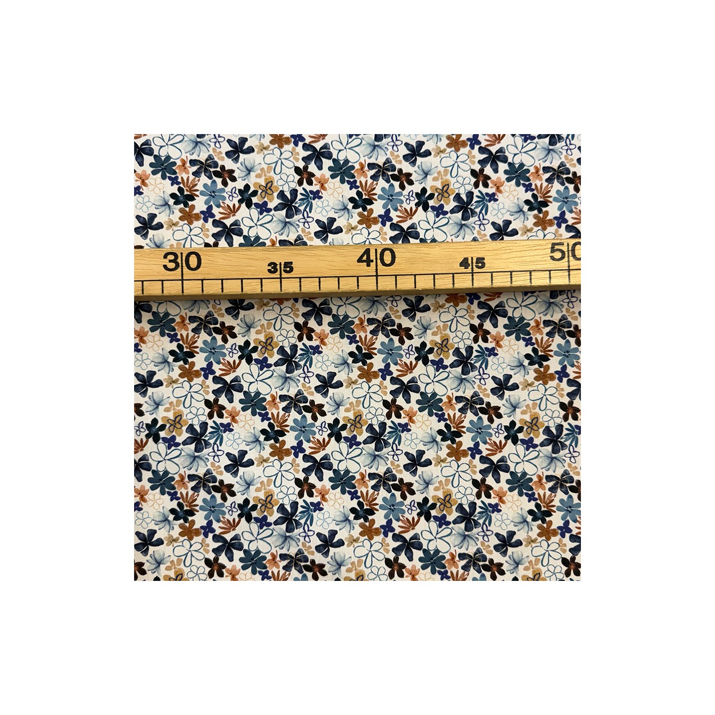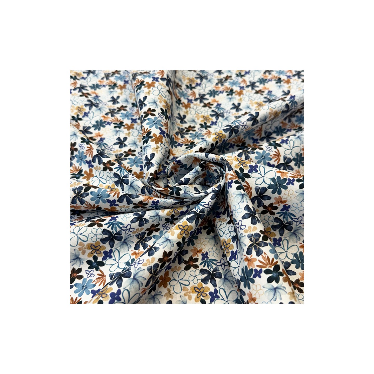 Sur un fond blanc éclatant, ce tissu présente un motif "all-over" composé de petites fleurs stylisées. La palette de couleurs est à la fois douce et dynamique : des nuances de bleu jean, de bleu ciel et de bleu marine se mêlent à des touches de jaune ocre et de terre de Sienne. Ce mélange de tons chauds et froids sur la base claire apporte une luminosité incroyable à l'étoffe, rendant chaque création visuellement légère et pétillante.