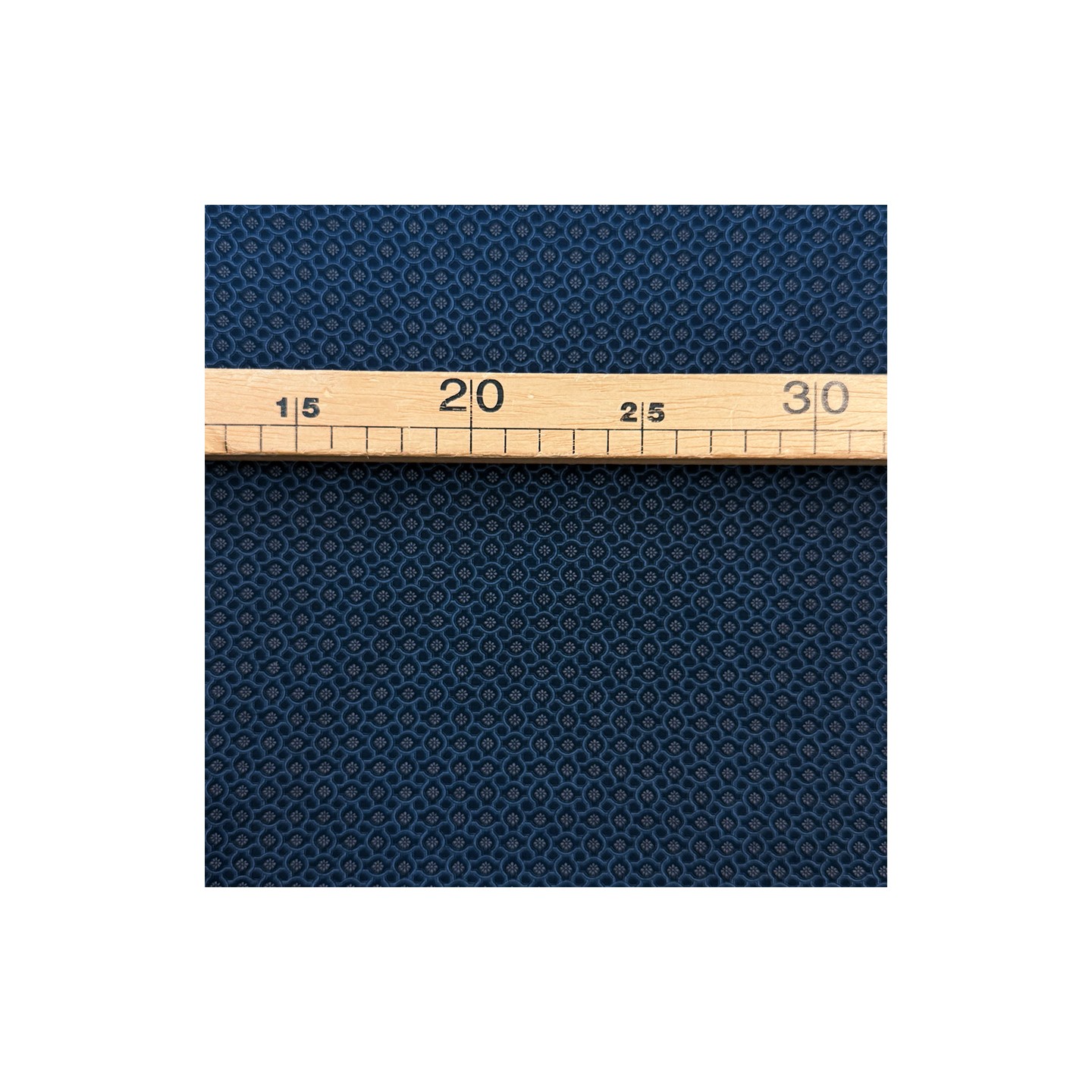 Sur un fond bleu marine profond et intense, se déploie un réseau régulier de petites alvéoles ou médaillons stylisés. Au cœur de chaque motif, une micro-fleur ou une étoile délicate apporte une touche de contraste et de relief. Ce jeu de textures visuelles crée une allure à la fois classique et résolument moderne, typique de l'élégance "Couture" italienne. La régularité parfaite de l'imprimé témoigne de la qualité supérieure des techniques d'impression utilisées par les filatures transalpines.
